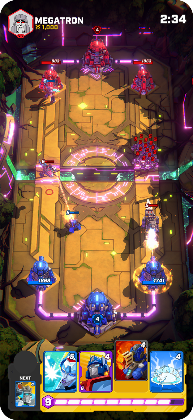 Compete against players worldwide in real-time PvP strategy matches. Bring your squad to victory through a variety of competitive arenas, including Cybertron, Chaar, Jungle Planet, Arctic Outpost, Sea of Rust, Orbital Arena, Pit of Judgement, Velocitron, Prehistoric Earth, and more!